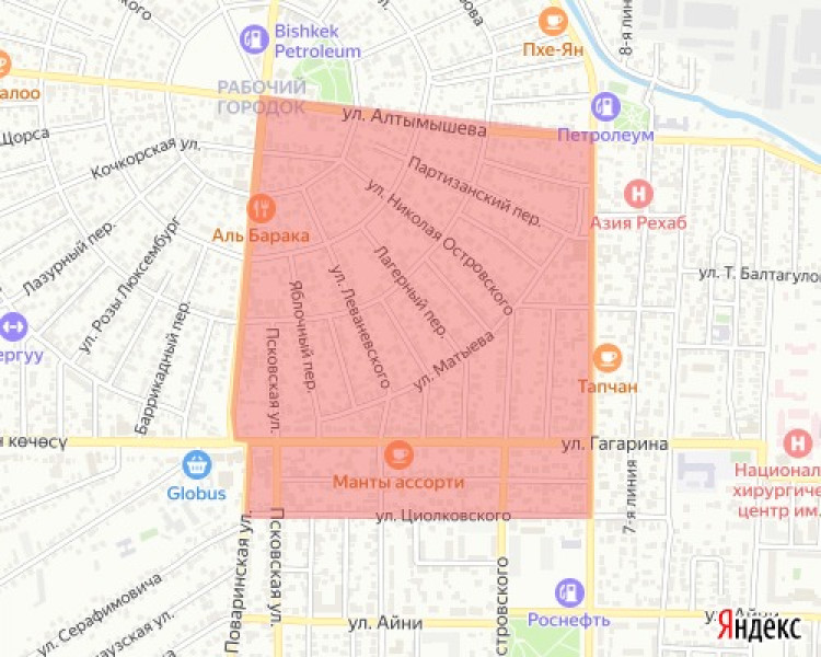 Асаналиев көчөсү – Алтымышев көчөсү – Бакаев көчөсү – Циалковский көчөсү.