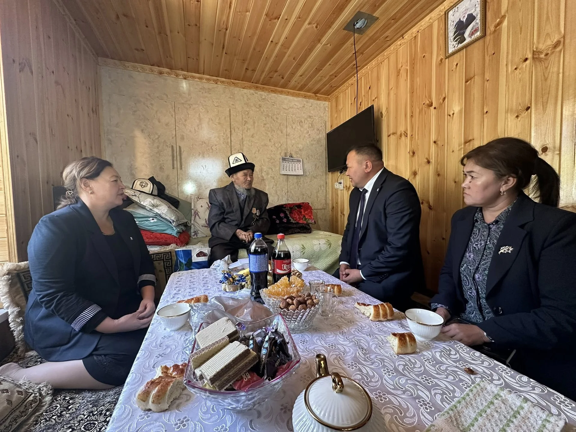 Облус жетекчисинин орун басары Бактыбек Токсонбаев Баткен районунун Согмент айылынын тургуну, 100 жаштагы Назарали Ураимовдон кабар алып, белектерин тапшырды.