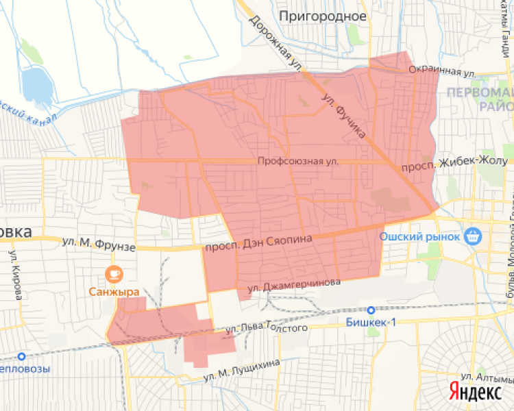 — 1-квадрат. Алыкулов көчөсү – Кустанай көчөсү – Муром көчөсү – Садыгалиев көчөсү – Л.Толстой көчөсү – Coca-Cola району;