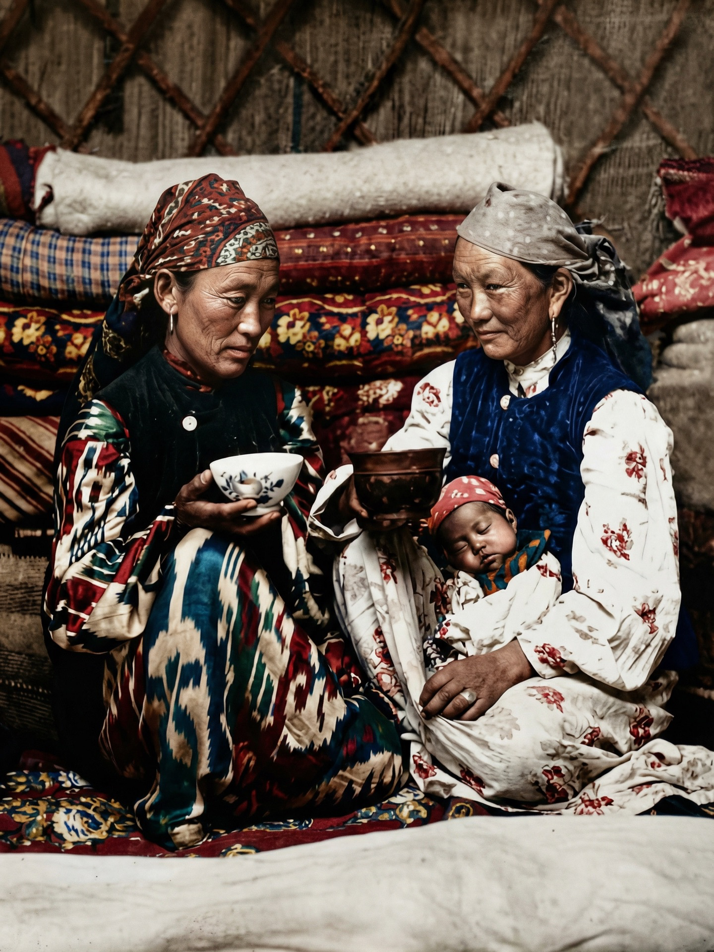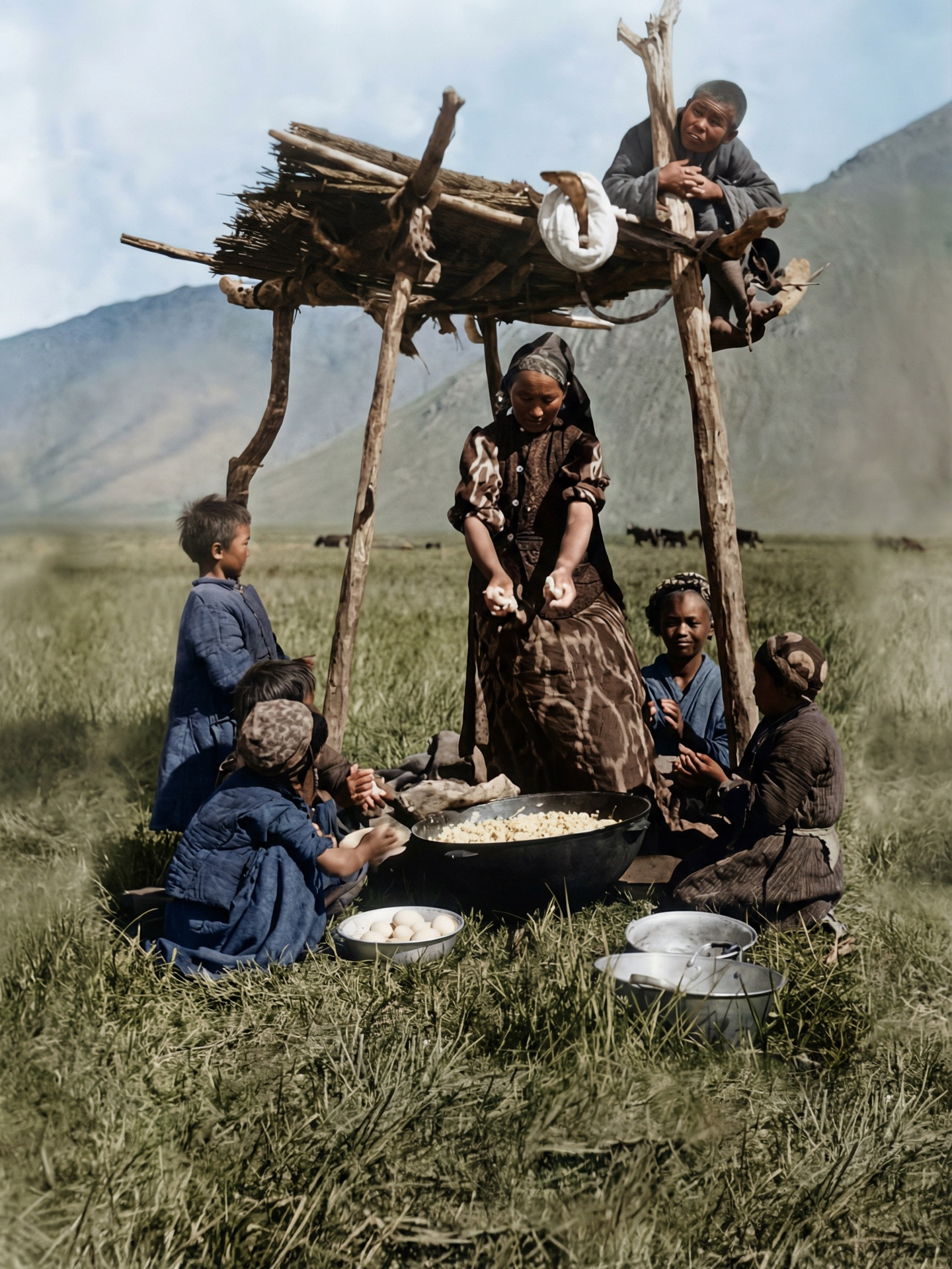 Бул архивдик сүрөттөр жасалма интеллект технологиясын колдонуп жаңыртылган. Түстөрдү калыбына келтирип, кездемелердин текстурасын жана адамдардын жүзүндө чагылдырылган мүнөздү мүмкүн болушунча реалдуу түрдө жеткирүүгө аракет кылынган.
