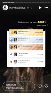 Кыргызстандык Мэри Кувакова «Аалам сулуусу-2025» сынагында элдик добуш берүүдөн ТОП-5ке кирди. Ага 22 миң 493 добуш берилген.