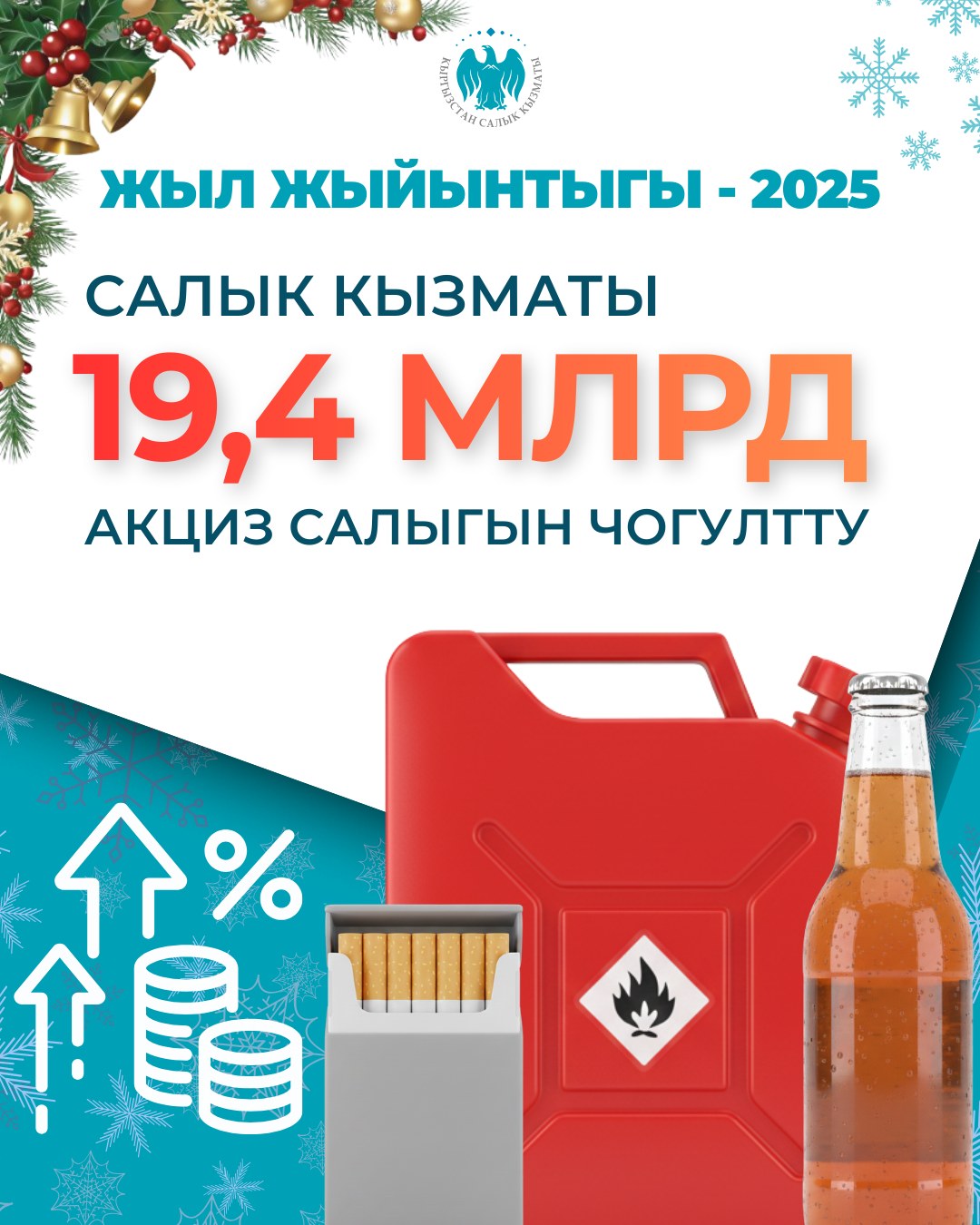 2025-жылдын 11 айында Мамлекеттик салык кызматы өлкөдө өндүрүлгөн жана ЕАЭБге мүчө мамлекеттерден алынып келинген товарлардан бюджетке 19 млрд 493,06 млн сом акциз салыгынын түшүүсүн камсыз кылды.